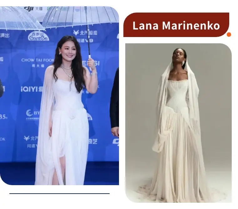 马思纯的Lana Marinenko白纱礼裙,像从雨雾里走出来的仙女。抹胸款的纱裙自带朦胧的破碎感,飘逸的披肩纱袖仙气十足,搭配满钻的项链,雨中撑伞的画面氛围感直接拉满,温柔又松弛的状态,把白裙的浪漫感穿得淋漓尽致。
