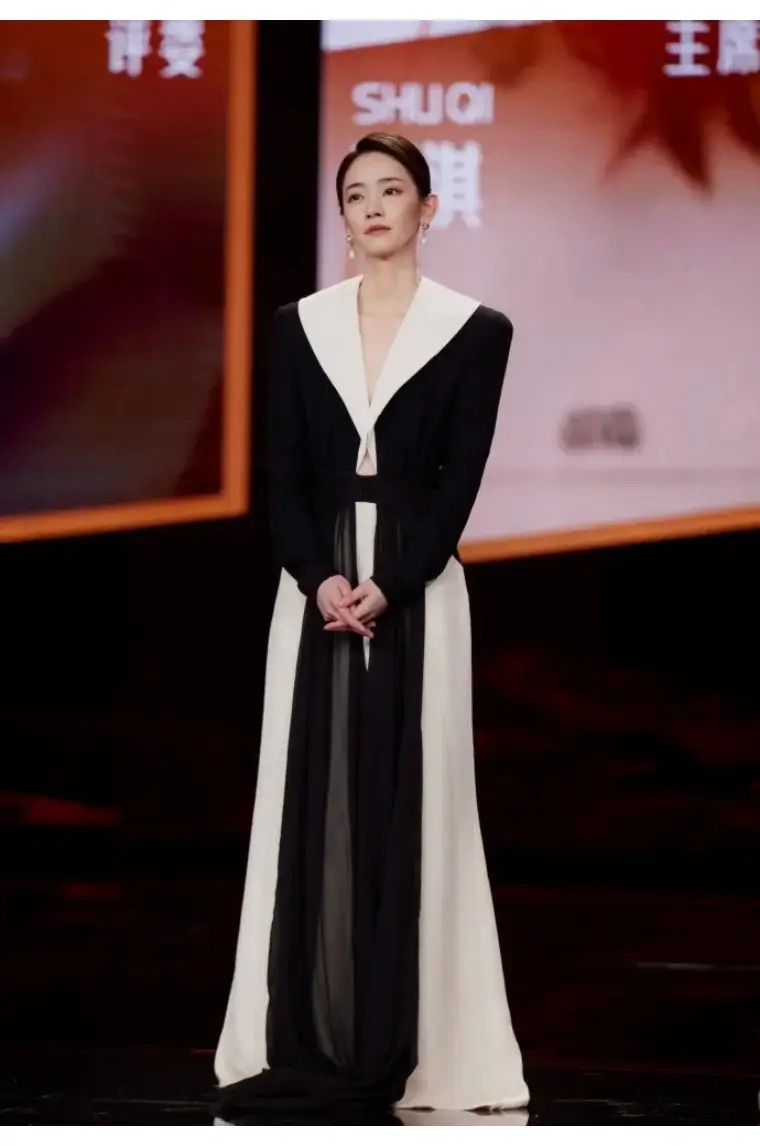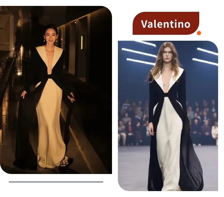 刘雅瑟这套Valentino2026春夏黑白礼裙,妥妥的“大女主战袍”。夸张的白色大翻领自带复古滤镜,深V+收腰设计勾勒出利落的腰线,黑纱拼接的裙摆又添了几分朦胧的戏剧感。