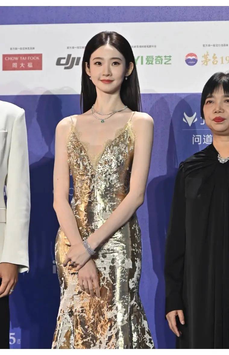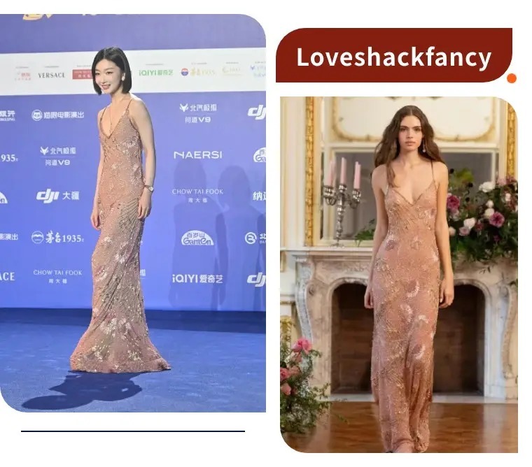周冬雨身穿Loveshackfancy2026秋冬系列香槟金亮片鱼尾裙走上红毯,深V吊带+鱼尾剪裁,把身材显得很修长,手工刺绣的花卉图案和碎钻,在红毯上闪得温柔又不张扬。