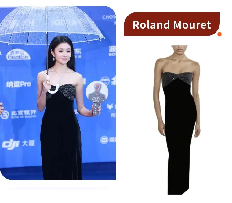 刘浩存身穿Roland Mouret黑丝绒抹胸长裙,愈加轻熟有味道,上半身的烫钻蝴蝶结设计blingbling的,搭配丝绒的哑光质感,又甜又贵气。