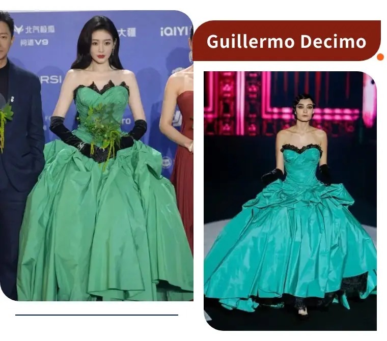 张天爱身穿Guillermo Decimo绿色礼服,直接在红毯上炸场!亮眼的薄荷绿缎面搭配夸张大裙摆,像把春天穿在了身上,黑蕾丝抹胸和长手套又添了几分复古贵气。