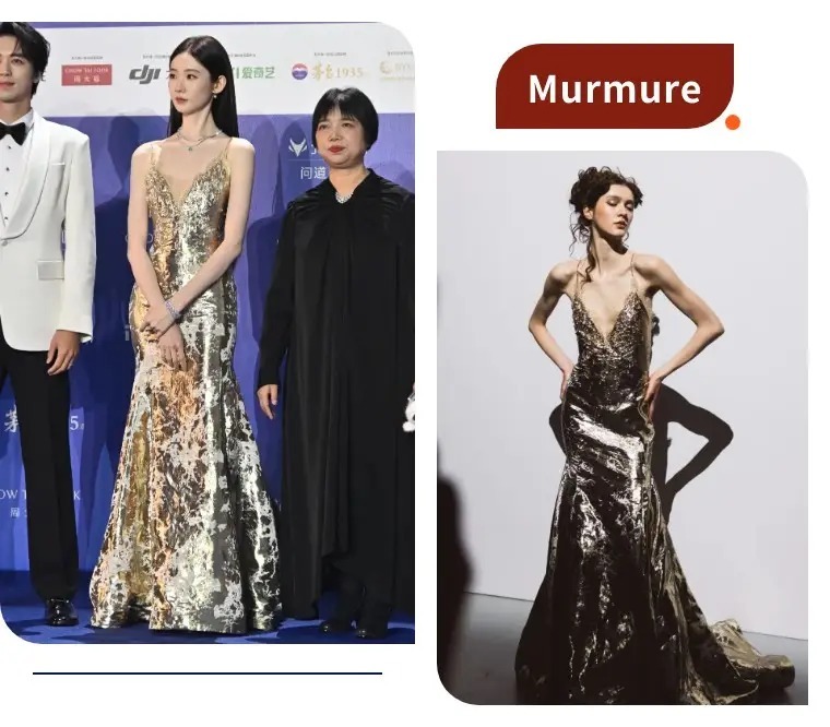 张艺凡的鎏金鱼尾礼裙,来自小众设计师品牌Murmure,烫金的面料自带波光粼粼的光泽感,蕾丝边的吊带和V领设计温柔又有女人味,鱼尾裙摆把身材曲线衬得恰到好处。