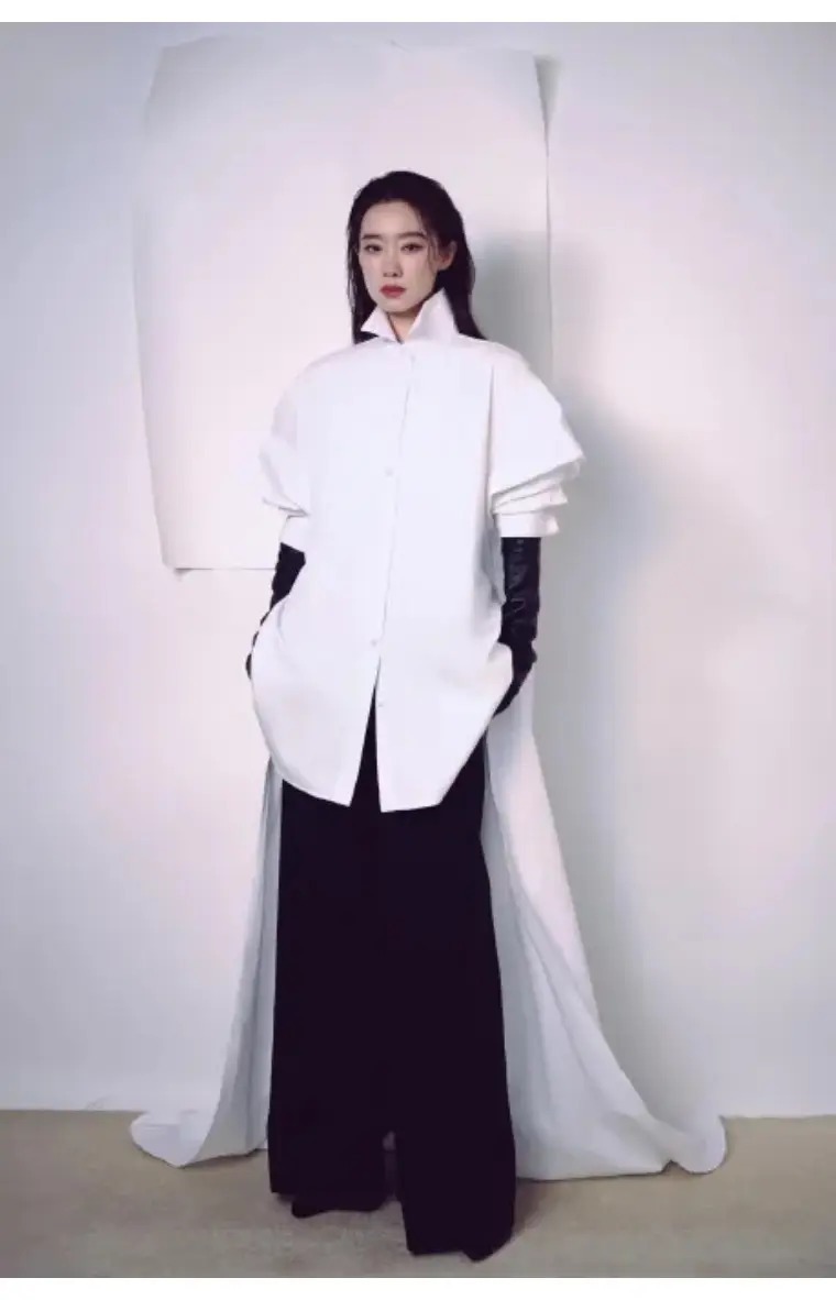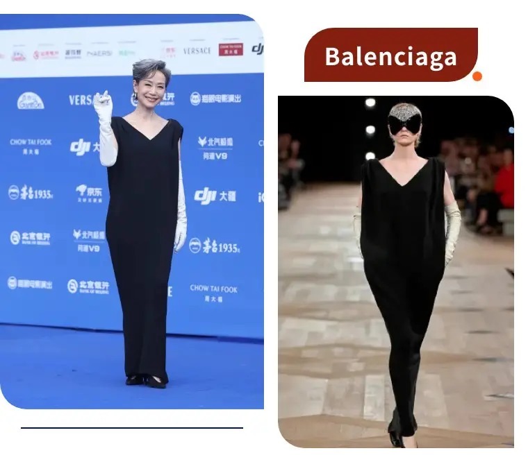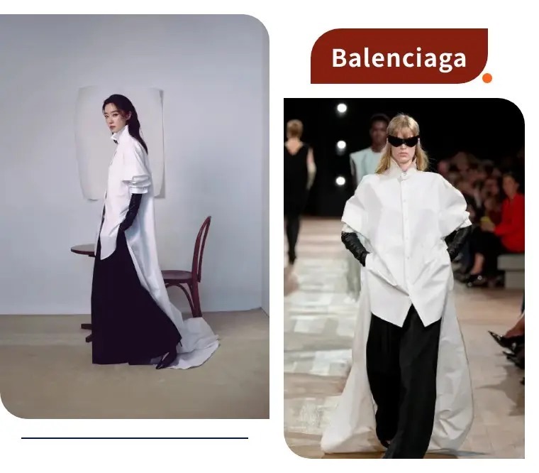 张小斐这套Balenciaga黑白造型,走的是“极简先锋路线”。Oversize白衬衫拖尾设计自带建筑感,利落的高领和阔腿黑裤搭配黑色手套,把“又美又飒”写在了身上。