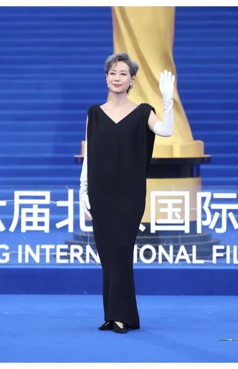 在闭幕上红毯上,叶童一如既往的优雅,身穿Balenciaga2026春夏系列黑色大V领长裙亮相,搭配白手套的造型,优雅且艺术,银灰短发利落又飒爽,气场稳到没话说。