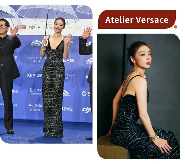 高叶的墨绿丝绒水钻礼裙来自Atelier Versace高级定制,复古贵气、线条流畅。深V+透视网纱的设计性感又不低俗,丝绒的质感自带复古滤镜,搭配金色珠宝,整个人贵气逼人,气场全开。
