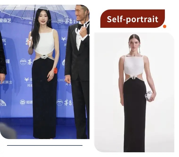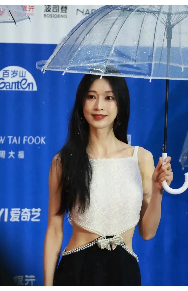 张俪一身Self-portrait黑白露腰礼裙,把“甜酷辣妹风”妥妥拿捏。上半身是带细闪的白色方领,下半身的黑色长裙用珍珠腰链+蝴蝶结点缀,露腰设计刚好露出最细的腰,雨中撑伞的画面又纯又欲。