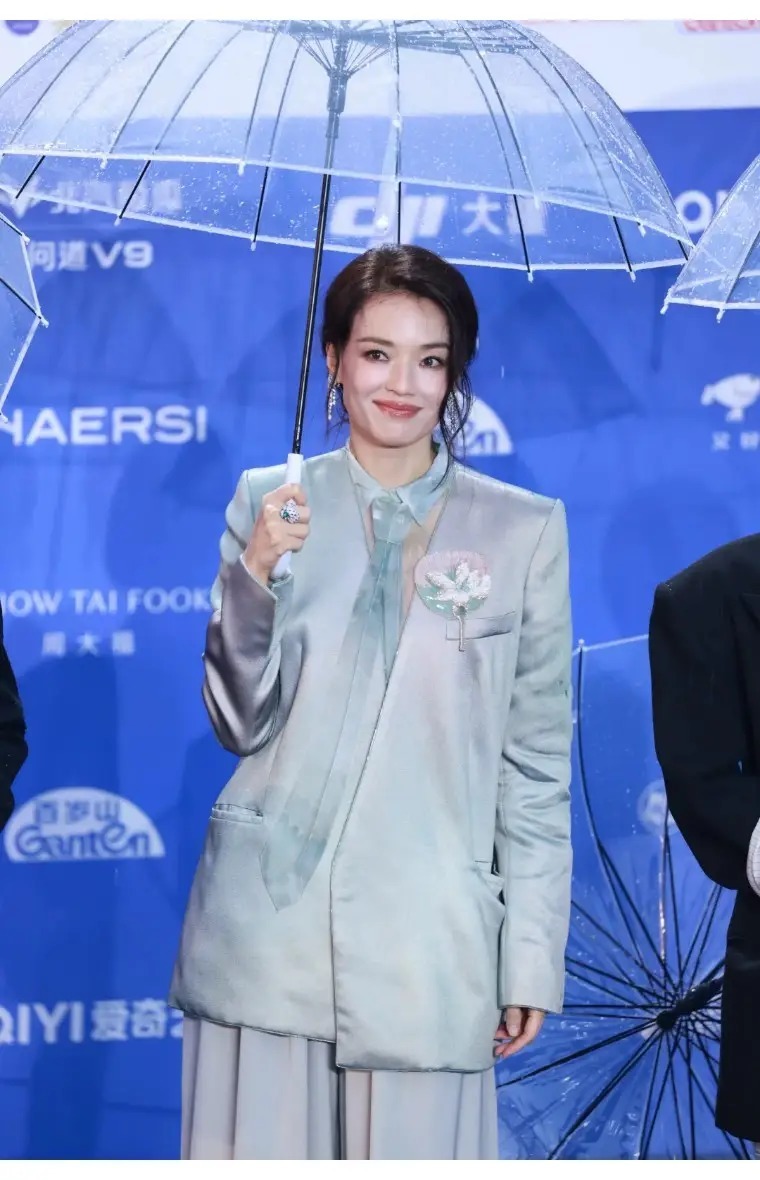 在北影节开幕红毯上,舒淇一身Armani高定薄荷绿缎面西装套装,既有大导的干练气场,又透着松弛的性感,西装上的胸针和透明的领带,细节里全是小心机,走在红毯也不失精致感。