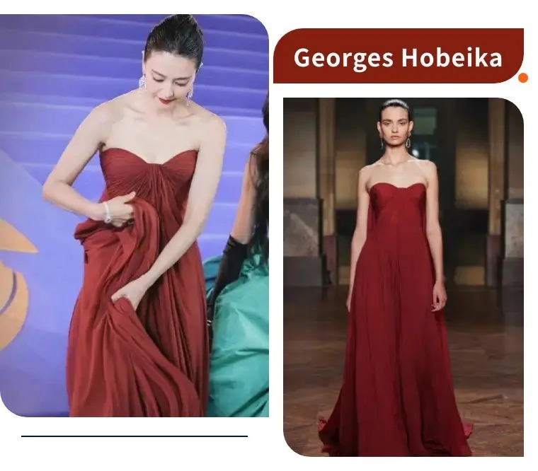 高圆圆身着Georges Hobeika2025秋季高定酒红色抹胸缀布连身长裙,酒红色丝滑垂坠,自带柔光滤镜。搭配Piaget高级珠宝,每一寸都透着高级感。