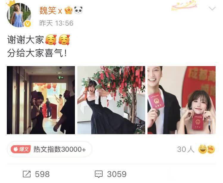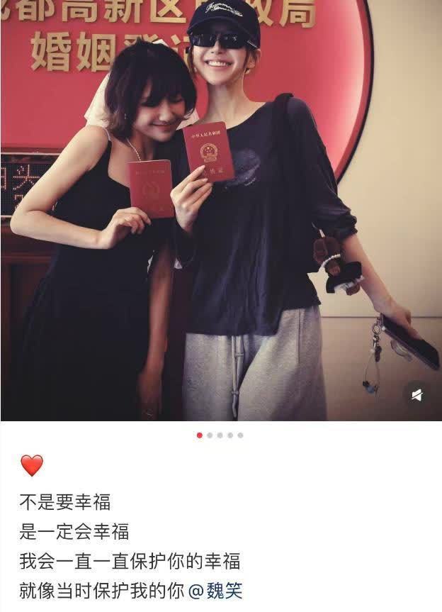 有趣的是,赵露思还放了一张自己和魏笑拿着结婚证的照片,魏笑满脸娇羞的依靠在她的肩膀上。